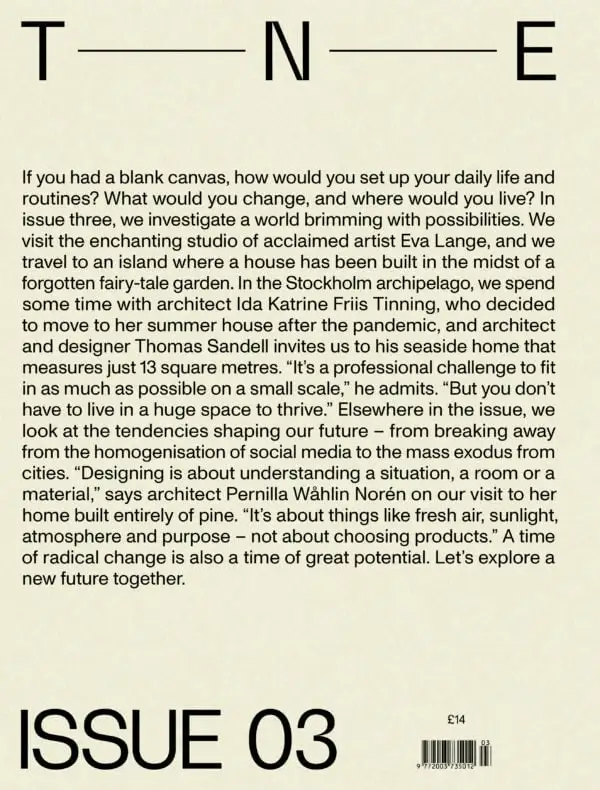 In der dritten Ausgabe erkunden wir eine Welt voller Möglichkeiten. Wir besuchen das bezaubernde Atelier der renommierten Künstlerin Eva Lange und reisen zu einer Insel, auf der ein Haus inmitten eines vergessenen Märchengartens gebaut wurde. Die Design-Ikone Pia Wallen nimmt uns mit auf eine exklusive Tour durch ihr Zuhause und der Architekt Thomas Sandell lädt uns in sein nur 13 Quadratmeter großes Haus am Meer ein. „Es ist eine Herausforderung, die mit dem Beruf einhergeht, so viel wie möglich auf kleinstem Raum unterzubringen“, gibt er zu. „Man braucht aber nicht besonders viel Platz, damit es einem gut geht.“ An anderer Stelle in dieser Ausgabe befassen wir uns mit den Trends, die unsere Zukunft prägen – wie der Vereinheitlichung durch die sozialen Medien der Rücken gekehrt wird und wie die massenhafte Stadtflucht von statten geht. „Beim Designvorgang geht es darum, eine Situation zu verstehen“, sagt die Architektin Pernilla Wåhlin Norén bei unserem Besuch in ihrem ganz aus Kiefernholz gebauten Haus. „Es geht um Dinge wie frische Luft, Sonnenlicht, Atmosphäre und Zweck – nicht um die Auswahl von Produkten.“