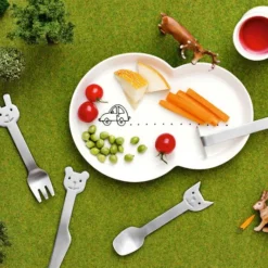 Abendessen macht Spaß, wenn Hase, Teddybär, Katze und Affe in der Küche herumtoben. Das Besteckset in Tierform von Gense besteht aus Messer, Gabel, Löffel und Schieber und hat ein abgerundetes, kindgerechtes Design, das in kleine Hände passt. Jedes Besteckstück ist aus Edelstahl mit einer schönen matten Oberfläche gefertigt.