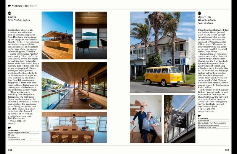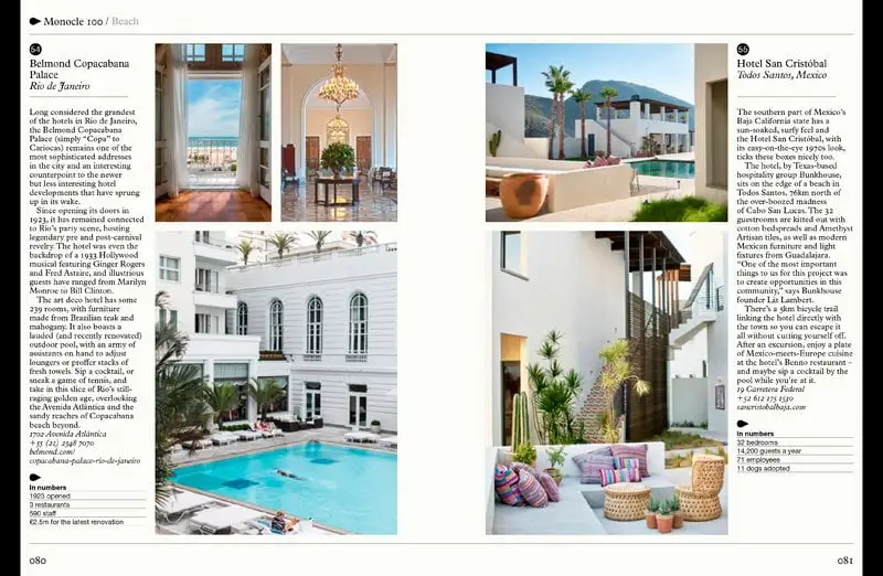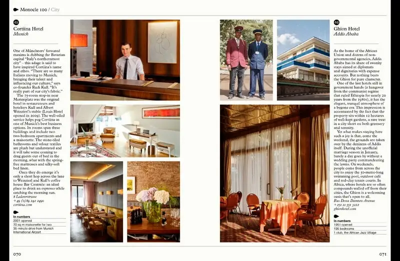 The Monocle Guide To Hotels, Inns and Hideaways bietet inspirierende und frische Perspektiven auf Unterkünfte sowohl aus der Sicht eines Reisenden als auch aus der eines angehenden Hoteliers. Die Redaktion des britischen Lifestyle-Magazins Monocle hat 100 ihrer Lieblingsunterkünfte auf der ganzen Welt ausgewählt und eine Liste mit den wichtigsten Merkmalen für ein perfektes – wenn auch imaginäres – Hotel zusammengestellt, zusammen mit Tipps und Tricks von Profis, wie man ein erfolgreiches Hotel betreibt. Das farbenfrohe, visuell ansprechende Buch wurde auf schweres Papier gedruckt. The Monocle Guide To Hotels, Inns and Hideaways ist Teil der Monocle-Reihe, die von Gestalten herausgegeben wird.