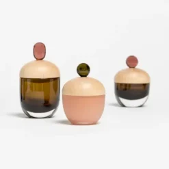 Die bezaubernden Lyyli-Gläser von Katriina Nuutinen vereinen die Traditionen der finnischen Glasbläserei und des Holzhandwerks zu einem spannenden, modernen Design. Das Aufbewahrungsglas besteht aus geblasenem und gefärbtem Glas und einem abgerundeten Holzdeckel – das i-Tüpfelchen ist ein kleiner Glasgriff in einer hübschen Farbe. Die Kombination aus hellem Birkenholz und glänzendem Glas ist hübsch und verspielt, und sie wirkt sogar noch niedlicher, wenn Sie mehrere Aufbewahrungsgläser miteinander kombinieren. Sie können die Aufbewahrungsgläser Lyyli, die einen Durchmesser von 6,5 cm haben, zur Aufbewahrung von Bonbons, Schreibzubehör, Klammern, Schmuck und anderen kleinen Schätzen verwenden.