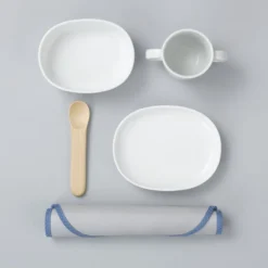 Nuppu-Geschirrsets bestehen aus einem Keramikbecher, einer Schüssel und einem Teller sowie einem charmanten Holzlöffel und einem passenden praktischen Lätzchen. Die Größen und schönen abgerundeten Formen der Produkte wurden sorgfältig entworfen, um nicht nur praktisch zu sein, sondern auch den Bedürfnissen von Kindern unterschiedlichen Alters zu entsprechen. Die Tasse hat z. B. zwei Griffe, so dass man leicht daraus trinken kann, und der Holzlöffel klappert nicht gegen das Keramikgeschirr, da das Kind gerade erst lernt, ihn zu benutzen. Reste können in der Schüssel aufbewahrt werden, wobei der Teller als Deckel dient.