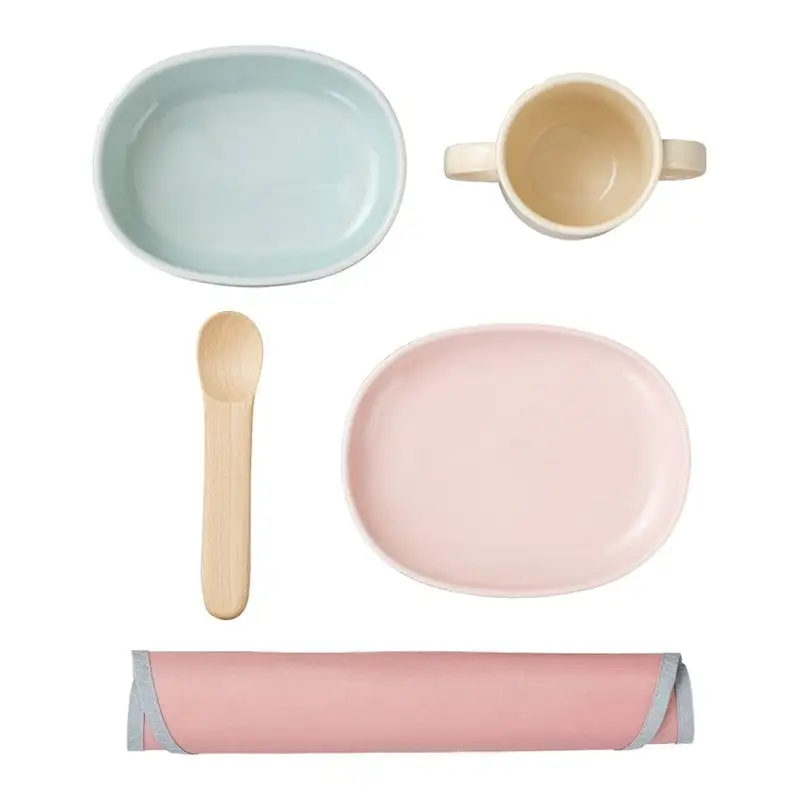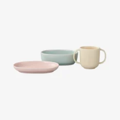 Nuppu-Geschirrsets bestehen aus einem Keramikbecher, einer Schüssel und einem Teller sowie einem charmanten Holzlöffel und einem passenden praktischen Lätzchen. Die Größen und schönen abgerundeten Formen der Produkte wurden sorgfältig entworfen, um nicht nur praktisch zu sein, sondern auch den Bedürfnissen von Kindern unterschiedlichen Alters zu entsprechen. Die Tasse hat z. B. zwei Griffe, so dass man leicht daraus trinken kann, und der Holzlöffel klappert nicht gegen das Keramikgeschirr, da das Kind gerade erst lernt, ihn zu benutzen. Reste können in der Schüssel aufbewahrt werden, wobei der Teller als Deckel dient.