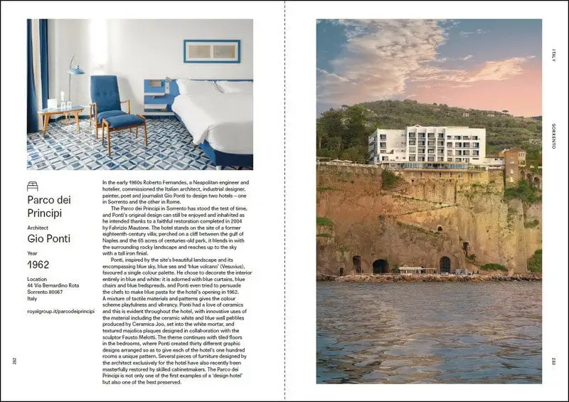 Farbfotografien von Außen- und Innenbereichen heben unglaubliche Details hervor, wie den leuchtend roten Zylinderkamin in Giancarlo de Carlos Ca‘ Romanino in Urbino (Italien) oder die konstruktivistisch anmutende Treppe in Renaat Braems Haus und Atelier in Antwerpen (Belgien). Zu jedem Gebäude gibt es einen informativen Text, der den Besucher:innen Informationen und Einblicke in die Geschichte des Gebäudes bietet. Ganz gleich, ob Sie auf der Suche nach einem einzigartigen Urlaubserlebnis oder einem globalen Überblick über die Architektur der Moderne sind, Modernist Escapes dokumentiert diese unvergesslichen Orte auf besonders stilvolle Weise.