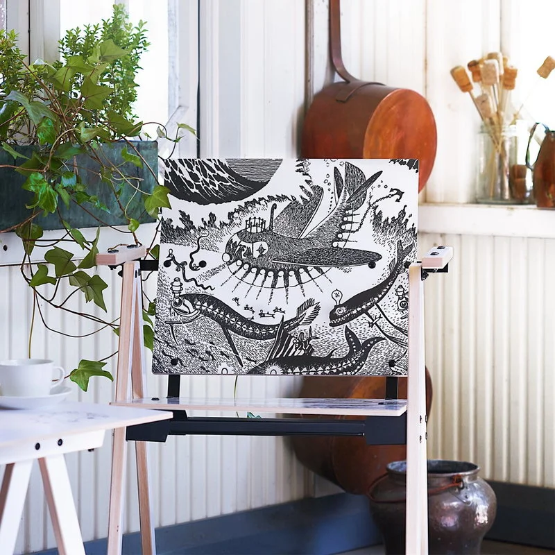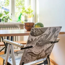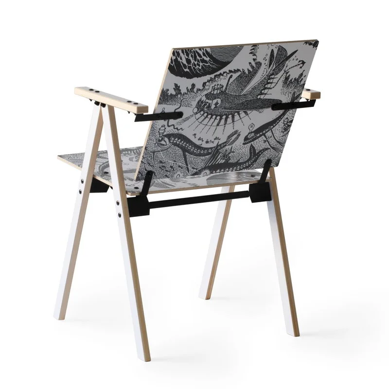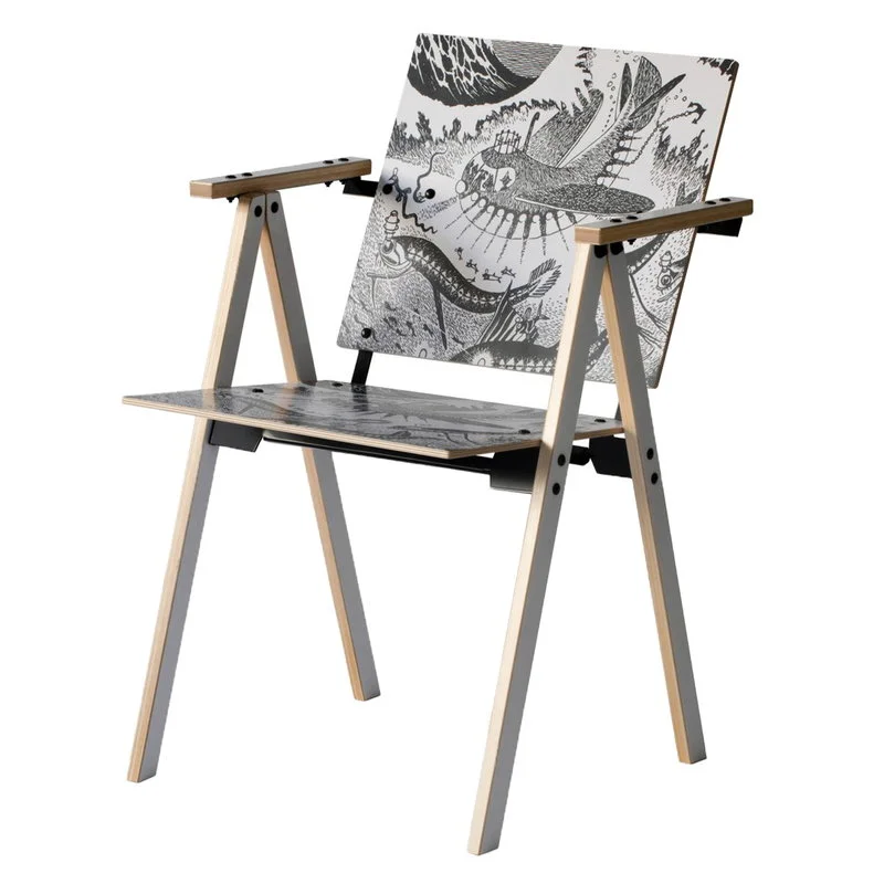 Der Mumin-Stuhl, entworfen von Yrjö Kukkapuro, feiert den 75. Geburtstag von Tove Janssons liebenswerten Mumin-Figuren. Der Mumin-Stuhl zeigt Janssons ikonisches Kunstwerk mit einer ikonischen Schwarz-Weiß-Illustration aus dem Mumin-Buch „Muminvaters wildbewegte Jugend“. Die große Ausführung ist für Erwachsene geeignet.